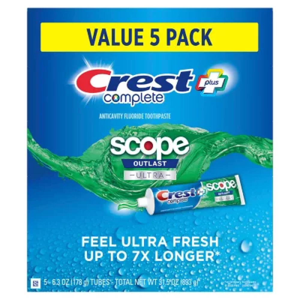 Содержит фторид, который помогает бороться с кариесом. Найдите вашу самую уверенную улыбку, добавив зубную пасту Crest Complete Plus Scope Outlast Ultra в свой режим ухода за полостью рта (чистка зубов 2 раза в день, как рекомендуют стоматологи). Этот набор из 5 тубок объемом 6,3 унции содержит больше продукта, чем шесть (6) обычных тубок зубной пасты.